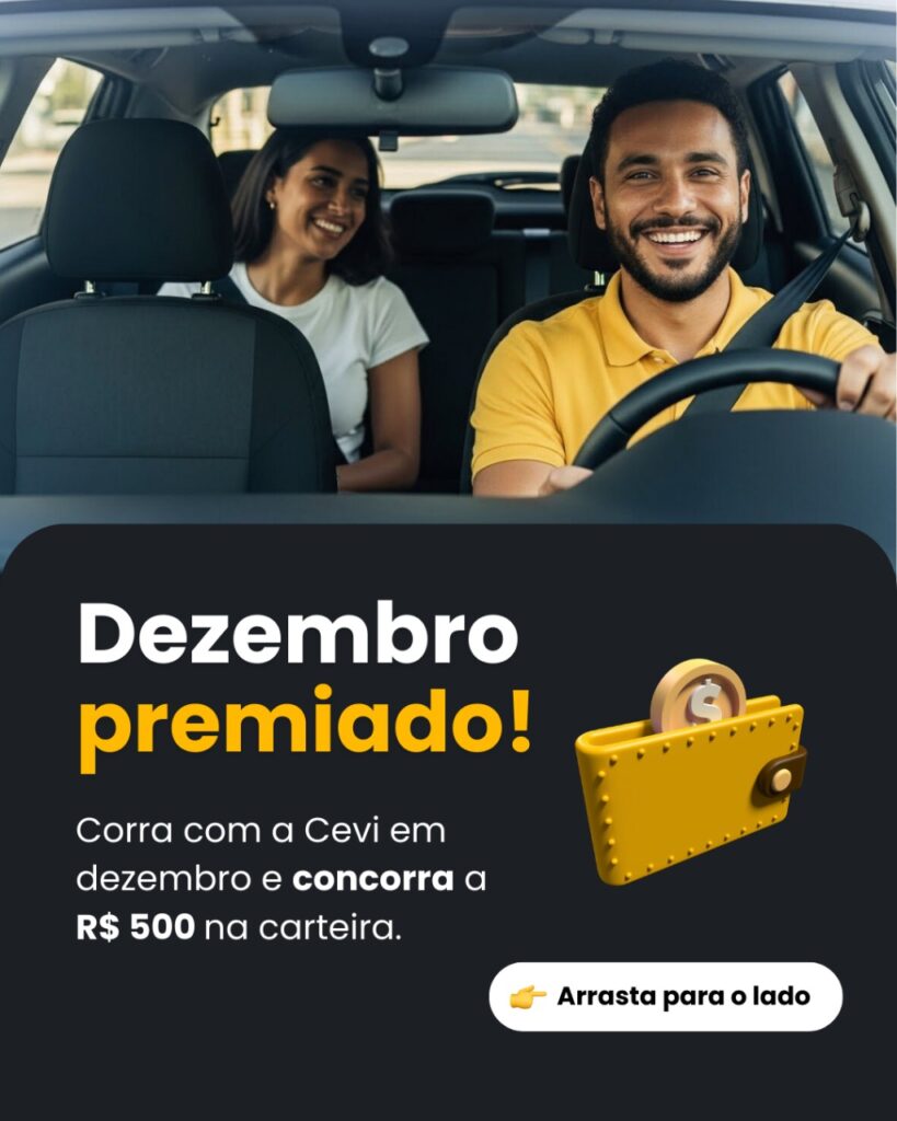 O fim de ano chegou com uma super novidade para quem corre com a Cevi! Durante todo o mês de dezembro, vamos premiar nossos usuários com R$ 500 em créditos na carteira Cevi — e o melhor: tanto o passageiro quanto o motorista ganham!