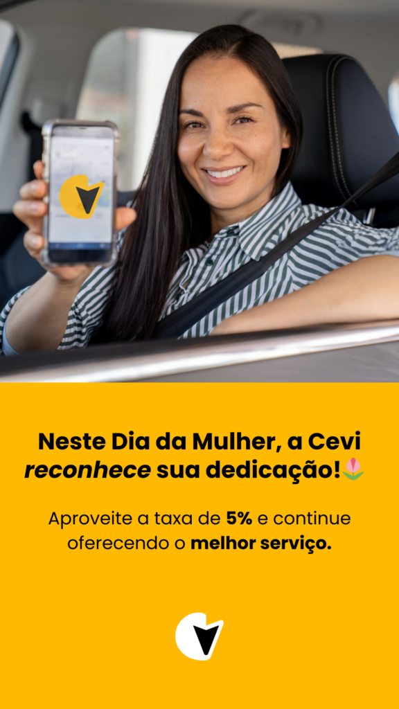 - Motoristas Mulheres: Reconhecendo a dedicação e o esforço das nossas incríveis motoristas, a CEVI está reduzindo a taxa de repasse para apenas 5%, como uma bonificação especial neste dia.